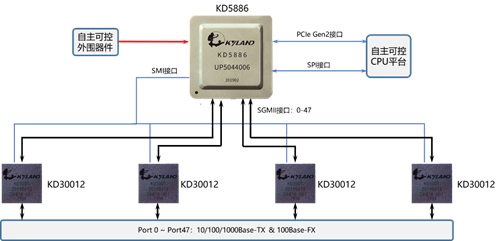 KD30012 GPHY芯片是国内首款全流程自主可控的高密GPHY芯片产品。芯片对外提供12个SGMII接口和3个QSGMII接口,支持10BASE-T、100BASE-TX、100BASE-FX和1000BASE-T业务。MAC接口支持SGMII应用模式、QSGMII应用模式。以太网接口支持自动协商、半双工和全双工、自动极性校准。支持双层内部环回测试,简化系统级调测。