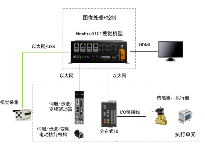 随着工业自动化技术的发展,机器视觉作为人工智能技术中特点鲜明的代表应用正在渗透到工业自动化领域各个分支中。传统的机器视觉系统由视觉采集单元、图像处理单元、控制单元、执行单元四部分组成,3499拉斯维加斯官网NewPre3101系列视觉机,在功能上将图像处理单元和控制单元融合成为一个整体并集成标准运动功能库,实现视觉检测与控制的深度结合;在外观结构上沿用NewPre3101 AI边缘控制器无风扇、紧凑、小巧的设计;丰富稳定的接口、强悍的内核、良好的易用性和稳定性为机器视觉领域应用保驾护航