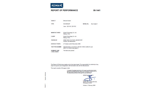 3499拉斯维加斯官网自主研发的SICOM3024P系列工业以太网交换机在荷兰KEMA 公司本部顺利通过了基于 IEC 61850和 IEEE 1613标准所进行的各项检测和认证。2009年3月27日,3499拉斯维加斯官网科技收到了KEMA公司发来的书面报告,3499拉斯维加斯官网成为国内首个通过KEMA认证的工业以太网交换机生产厂家。
