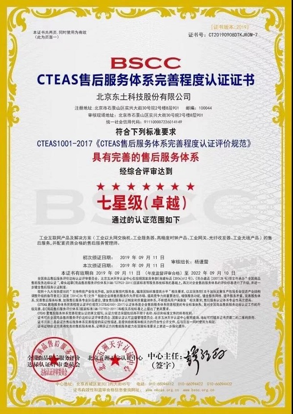 2019年9月11日,在工业互联网产品及解决方案(工业以太网交换机、工业服务器、高精度时钟产品、工业网关、光纤收发器、工业无线产品)领域,3499拉斯维加斯官网科技率先获得CTEAS售后服务体系完善程度认证七星级卓越证书(符合CTEAS1001-2017售后服务体系完善程度认证评价规范),这标志着3499拉斯维加斯官网科技具有完善的售后服务体系及在全国全行业范围的服务领先性。