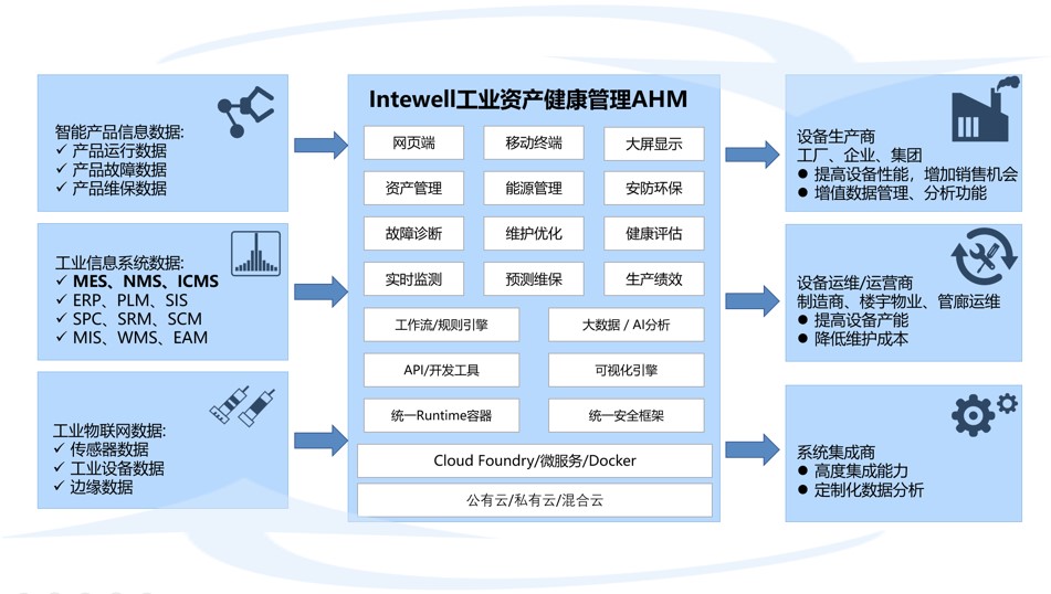 AHM是面向设备生产制造商、设备运营商、系统集成商所研发的工业资产健康管理系统。AHM综合运用IOT技术、工业大数据技术、人工智能技术,提供了资产建模、在线监视、智能运维、绩效分析、能耗分析、质量分析等核心功能,帮助客户全面实时掌握资产健康状况,提高运维效率,减少意外停机时间,降低维护成本,优化生产工艺过程,提高企业产能。
