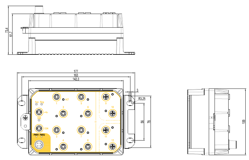 | 机械结构 | 外壳: 金属 散热方式: 自然冷却,无风扇 防护等级: IP65 尺寸: 100mm×177mm×111.7mm(H×W×D)带散热肋 100mm×177mm×73.4mm(H×W×D)不带散热肋 重量: <2Kg 安装方式: 壁挂式 |