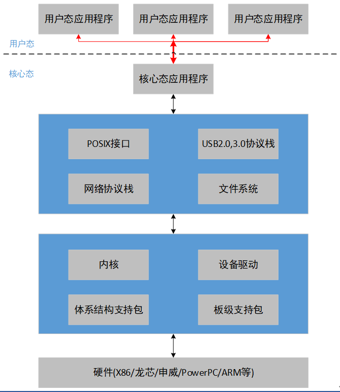 | 内核 | 支持基于优先级的抢占式多任务调度算法 支持进程 支持优先级抢占、时间片轮转任务调度策略,支持256个任务优先级 支持任务独立时间片 支持优先级继承策略,以防止优先级反转 支持定时器管理,支持绝对时间和周期性两种定时器触发方式 支持中断嵌套,保障高优先级的中断得到及时响应 支持信号量、异步信号、事件、消息队列等任务间通信、同步和互斥管理方式,支持消息发送等待 支持扩展点,可在系统初始化阶段、任务切换等时刻扩展系统行为 |