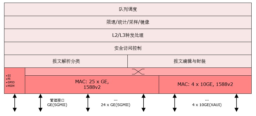 | 主要支持网络业务功能 | 支持 QinQ(802.1Q-in-Q)接口特性 支持 802.1ad 运营商桥接特性 支持 IPv4/IPv6 单播组播转发特性 支持每端口 8 个报文优先级, 4 个丢弃优 先级,支持优先级队列间的 DWRR/SP 调度, 支持 WRED 特性 支持 IEEE 802.3x 全双工/半双工流控 支持 IEEE 802.1ag 和 Y.1731 以太网 OAM 特性 支持 DDoS 防攻击特性,如可防御 TCP 或 UDP 泛洪、ICMP 泛洪及分片泛洪等 支持 1588v2 和同步以太网特性 支持 SI、PI 管理控制接口,可通过外置 CPU 很方便的对内部寄存器和存储器进行 管理配置 提供 MIIM 接口可对外部 PHY 芯片进行 管理 |