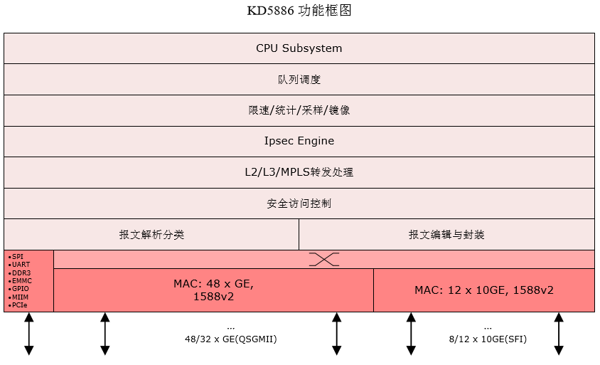 KD5886 是芯片前端设计、后端设计、仿真验证、芯片制造、封装与测试全流程在国内自主 研制完成的 128G/152G 安全以太网交换芯片, 可应用在园区网络和城域以太网络接入/汇聚场 景。KD5886 提供多种以太网接口配置(可配置 IPsec 流量):