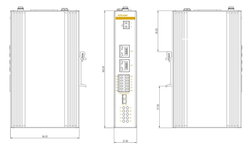 | 物理特性 | 散热方式 :自然冷却,无风扇 防护等级:IP40 安装方式:DIN卡轨式 外壳:铝制型材 设备尺寸(WxHxD):31×160×94mm 包装尺寸:70×236×197mm |