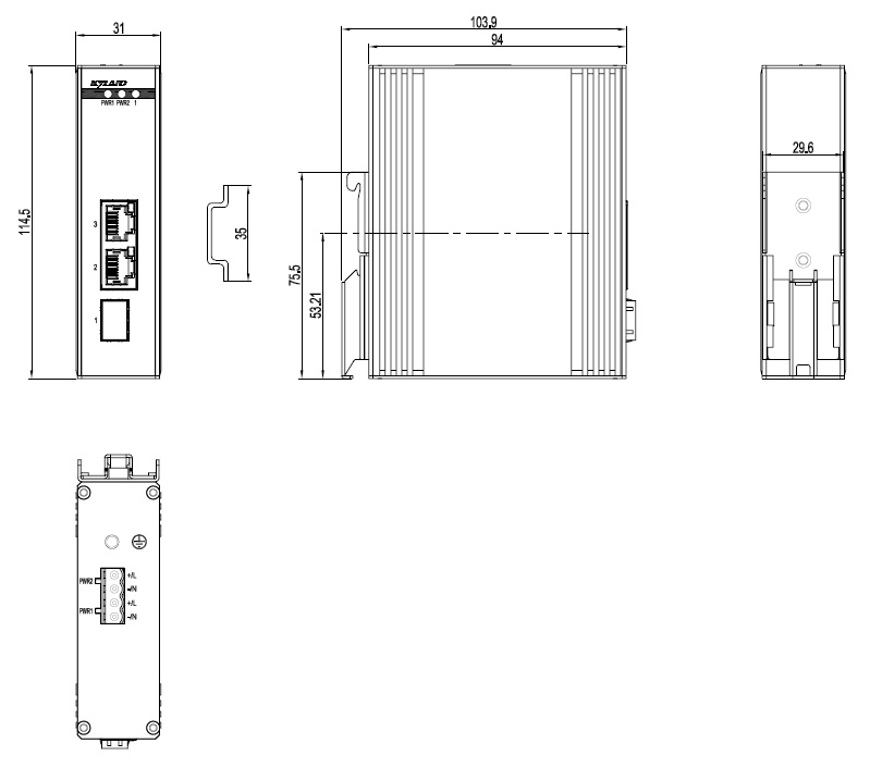 | 机械结构 | 外壳 金属材质 散热方式 自然冷却,无风扇 防护等级 IP40 尺寸 30mm×115mm×91.5mm(W×H×D)(1S2T,1M2T) 31mm×114.5mm×94mm(W×H×D)(1SFP2T) 重量 0.46Kg(1S2T,1M2T) 0.3Kg(1SFP2T) 安装方式 DIN卡轨式或壁挂式 |