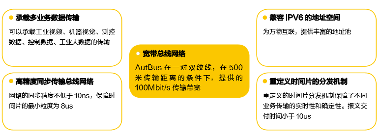 一个 AUTBUS 总线系统可支持 254 个有效节点,其中一个为控制节点、其他为终端用户节点。控制节点负责管理、分配、回收各系统资源,并实时给所有节点推送系统配置、分配通信带宽等。AUTBUS 使用总线式组网,通过系统预配置或动态申请的方式,提供固定带宽数据服务和支持突发数据的可变带宽数据服务;针对周期性采样数据,突发性的控制、告警以及ISO/IEC/IEEE 8802-3 以太网格式的 IPv4/IPv6 数据均能提供可靠和确定性的承载。具有高精度时钟同步的功能,基于时间触发提供对时间敏感性和非时间敏感性业务提供确定性的数据传输服务。