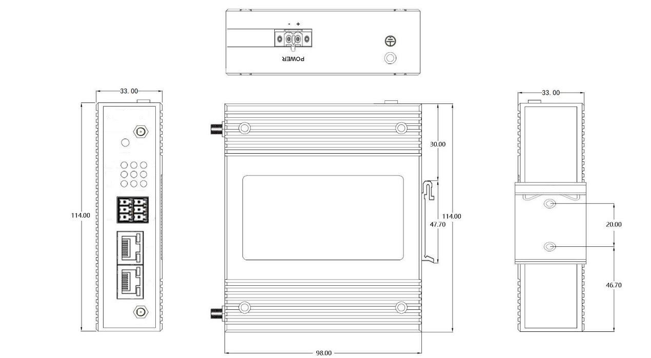| 环境条件 | 工作温度:-40 to 70℃ 存储温度:-40 to 70℃ 相对湿度:5 ~ 95%,无凝露 散热方式:自然冷却, 无风扇 防护等级:IP40 安装方式:DIN 卡轨式 |