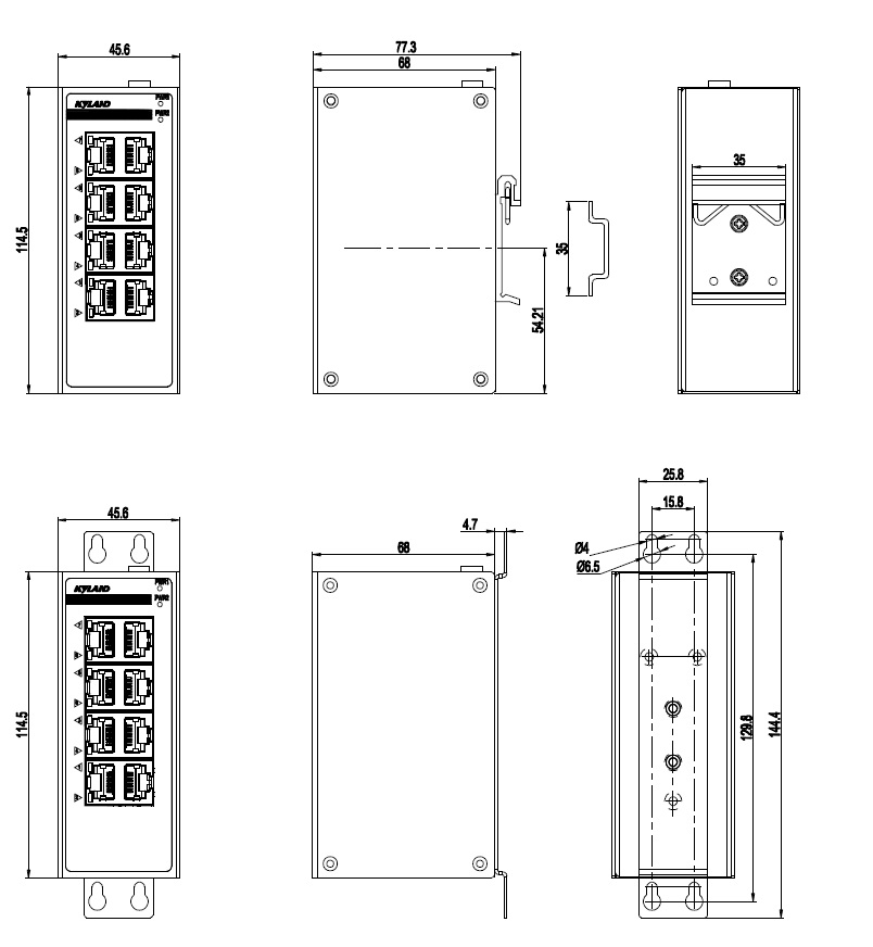 | 机械结构 | 外壳 金属材质 散热方式 自然冷却,无风扇 防护等级 IP30 尺寸 45.6mm×114.5mm×68mm (W×H×D) 重量 0.3Kg 安装方式 DIN卡轨式或壁挂式 |