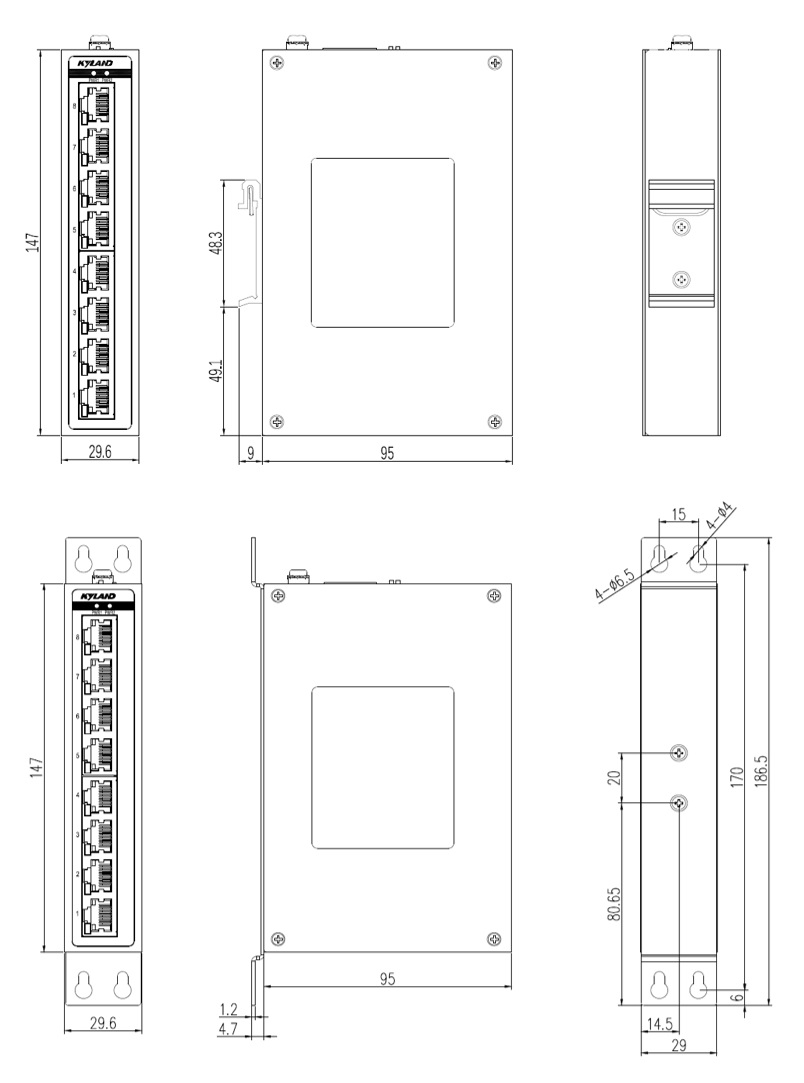 | 机械结构 | 外壳 金属材质 散热方式 自然冷却,无风扇 防护等级 IP30 尺寸 29.6mm×147mm×95mm (W×H×D) 重量 0.3Kg 安装方式 DIN卡轨式或壁挂式 |